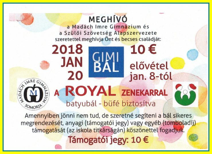 A Madách Imre Gimnázium és a Szülői Szövetség Alapszervezete szeretettel meghívja Önt és becses családját 2018 január 20-án megrendezésre kerülő Gimibálra. A zenét a Royal zenekar szolgáltatja. Belépő: 10,-euro
