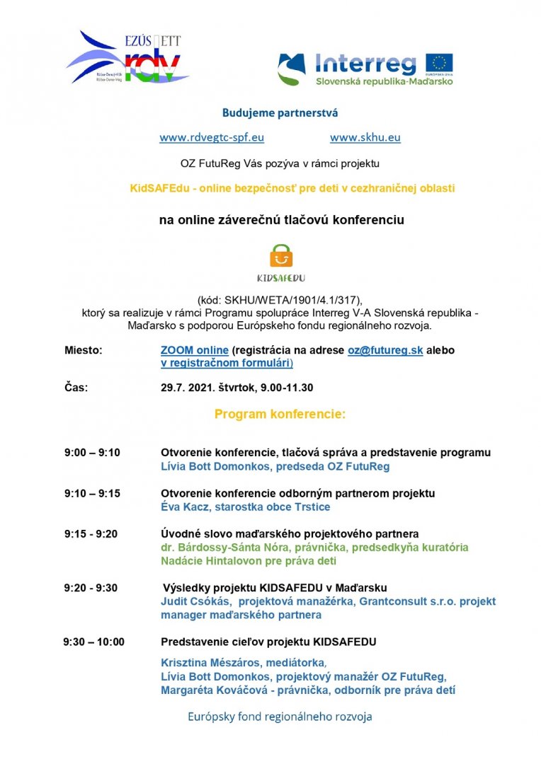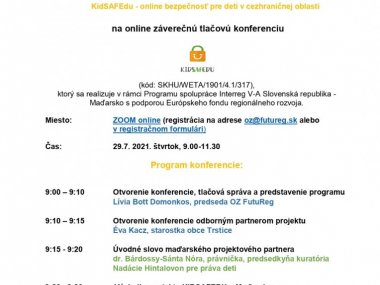 Projekt KIDSAFEDU (SKHU/WETA/1901/4.1/317) s podporou Fondu malých projektov Pro- gramu spolupráce INTERREG V-A Slovenská republika-Maďarsko hľadá cezhraničné riešenia chrániace deti pred nebezpečenstvami kyberšikany a vzdelávania v oblasti digitálnej gramotnosti pomocou online záverečnej konferencie dňa 29. júla 2021.