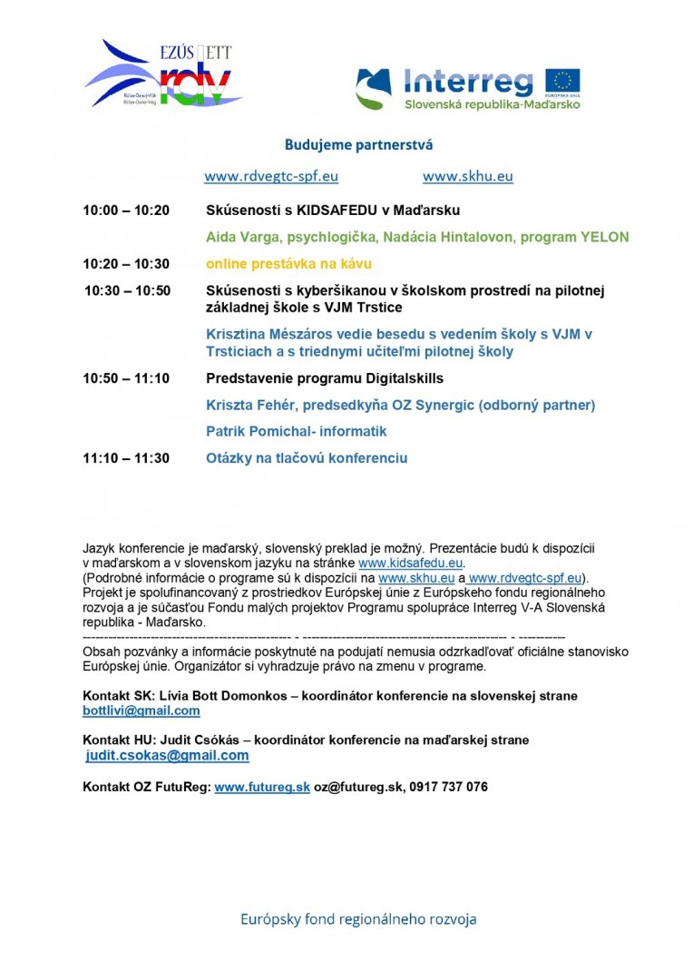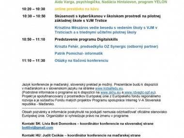 Program podujatia začína úvodnými slovami predsedu vedúceho partneru Lívii Bott Domonkos, partnera projektu Trstice, zastúpeným Evou Kacz nasleduje podrobnejšie predstavenie projektu, programu a cezhraničnej spolupráce a neskôr predstavenie odborných parterov, účastníkov konferencie, krátke predstavenie projektu KIDSAFEDU a cieľov konferencie a platformy konferencie DIGITALSKILLS, kde sú dostupné všetky materiály pre účastníkov. Konferencie sa zúčastnia odborníci spolupracujúcich organizácií, ako Krisztina Mészáros, mediátorka, Margaréta Kováč, právnička, Patrik Pomichal, informatik a pilotná škola Trsticiach. O cyberbullyingu a online bezpečnosti v Maďarsku a o projekte po- rozpráva Nadácia Hintalovon a projektová manažérka maďarskej strany Judit Csókás.
