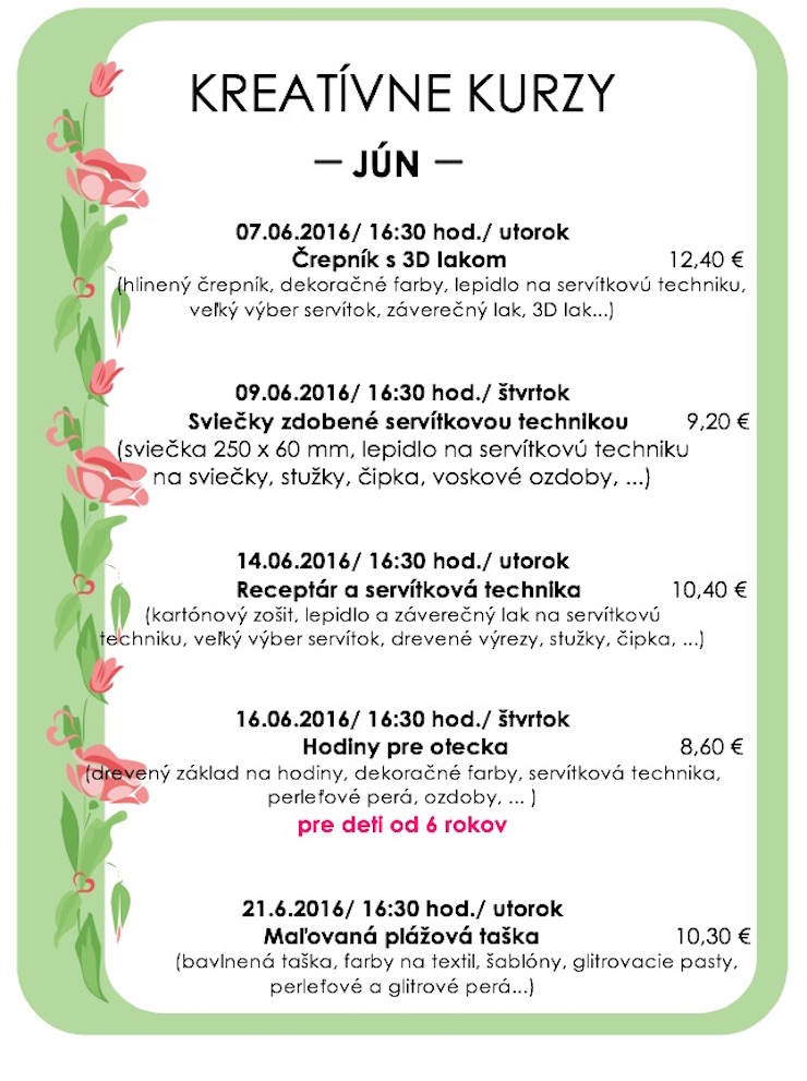 Kreatívny obchodík Moniky Výbochovej otvára júnové kurzy. V cene kurzu je zahrnutý všetok materiál.