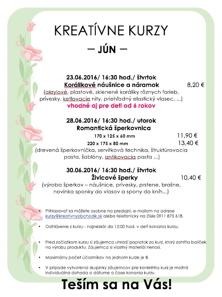 Prihlasovať sa môžete osobne na predajni (budova Alex, Hlavná 45), e-mailom na adrese kurzy [at] kreativnyobchodik.sk alebo telefonicky na čísle 0911 875 618.