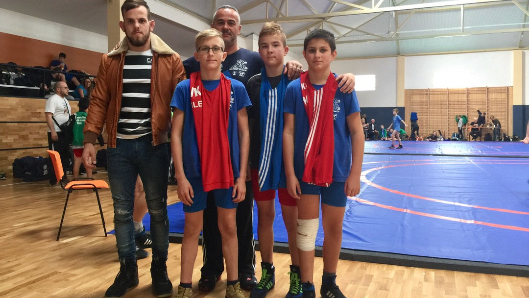 Chlapcom radil a povzbudzoval ich aj úspešný zápasník Jusuf Ahmeti (vľavo). Šamorín reprezentovali Mátyás Szeiler, Marek bartaloš a Jurko Čukan s trénerom Oliverom Oláhom.