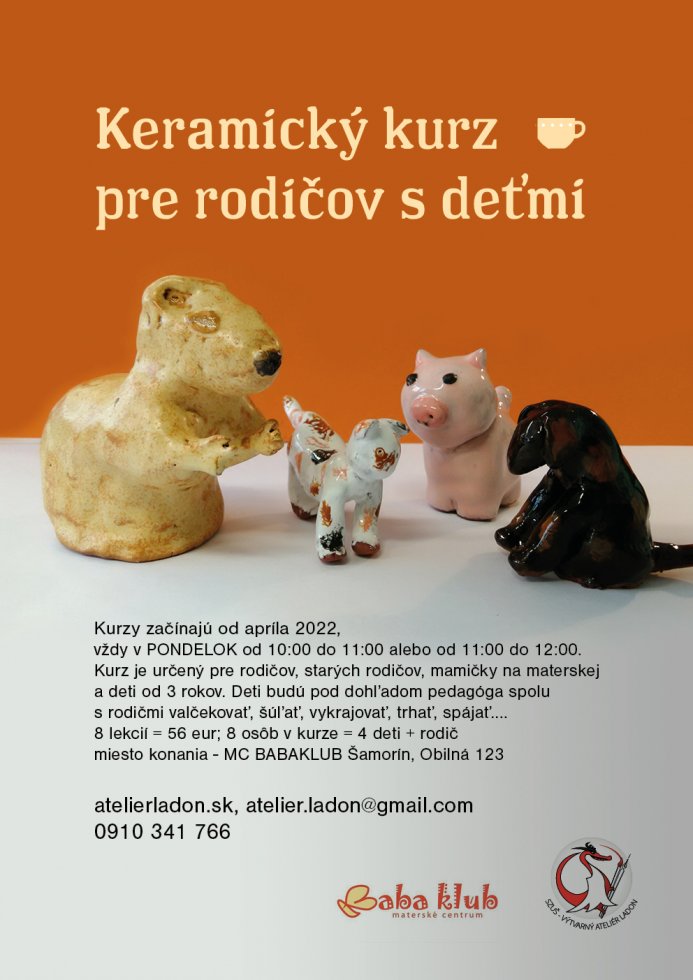 MC Baba Klub pozýva všetkých záujemcov na svoje kurzy. Kurz keramiky pre detičky s rodičmi pokračuje už v pondelok! Ak chcete, aby pod vašimi rukami vznikali krásne výrobky, nezabudnite sa prihlásiť. Nielen detičky si u nás nájdu uplatnenie. Kreatívny kurz pre dospelých začína už čoskoro, preto ak máte záujem, neváhajte sa prihlásiť. V prípade otázok sme vám k dispozícii.