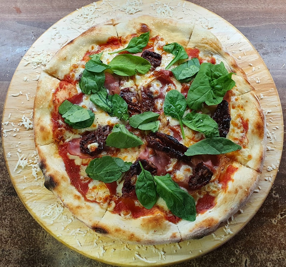 Špeciál na júl: (600g) pomodoro, syr Mozzarella, taliansky speck, sušené paradajky, baby špenát. Cena je 9 €.