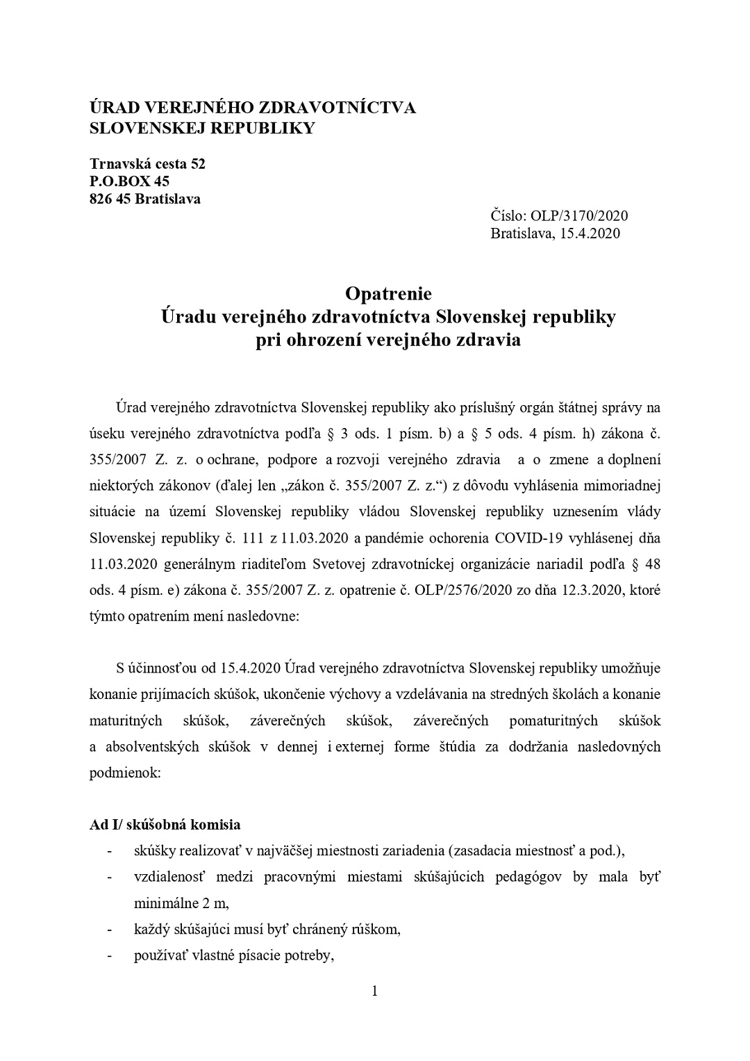 Hlavný hygienik tiež prikazuje, aby boli všetci chránení rúškom – študenti aj pedagógovia. Každý z nich musí mať vlastné písacie potreby. Pred skúškou bude študentom aj učiteľom zmeraná telesná teplota.