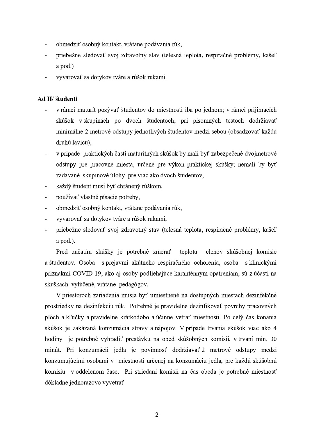 Tou základnou podmienkou je, aby všetci prítomní v škole medzi sebou dodržiavali dvojmetrové odstupy. Podmienkou je, aby sa skúšky konali v najväčšej miestnosti školy, napríklad vo väčších zasadačkách.