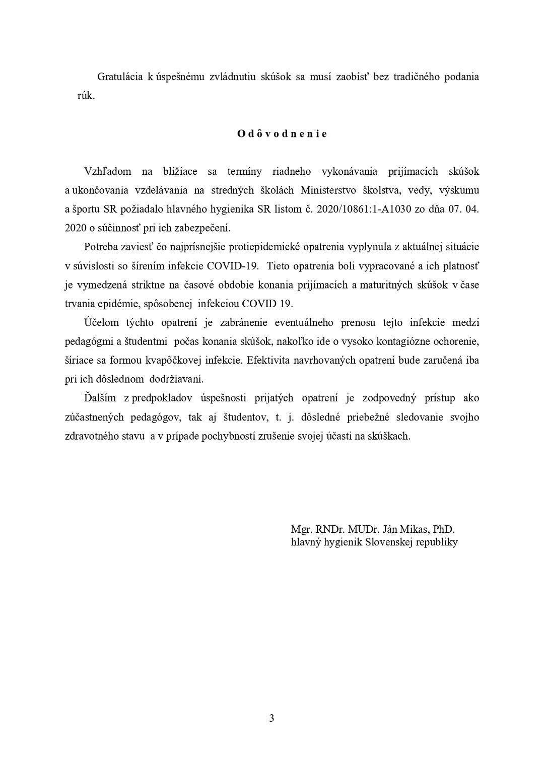 Hygienik však stanovil niekoľko prísnych podmienok, ktoré musia školy dodržať. “Gratulácia k úspešnému zvládnutiu skúšok sa musí zaobísť bez tradičného podania rúk,” píše sa napríklad v opatrení.