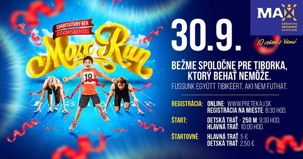 Zábavno-obchodné centrum MAX Dunajská Streda v spolupráci s Marathon club Žitný Ostrov a Slovenským červeným krížom ťa srdečne pozýva na 3.ročník charitatívneho behu – MAX RUN, ktorý sa uskutoční dňa 30. septembra 2018.