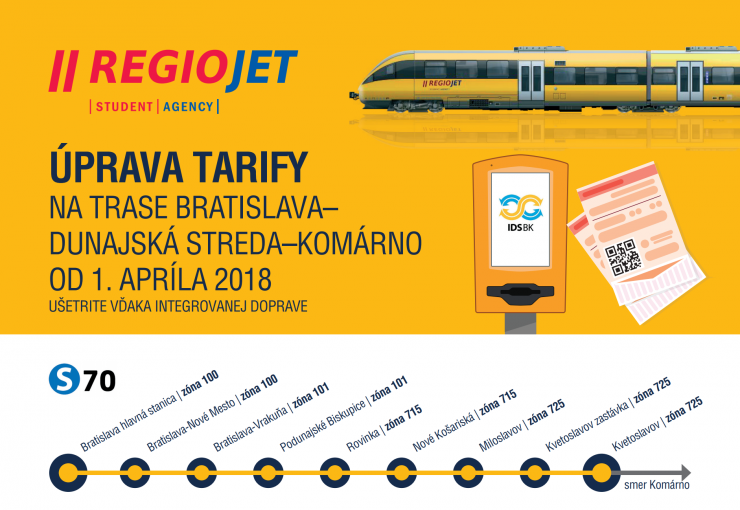RegioJet dnes ráno vypravil prvý vlak, ktorý je zaradený do integrovanej dopravy. Linkou S70, ktorá premáva z centra mesta do východnej časti Bratislavy a následne až do Kvetoslavova budú môcť cestujúci cestovať s bežnou električenkou či lístkom IDS BK (lístkom na MHD).