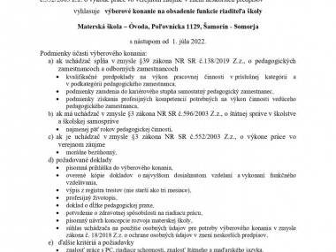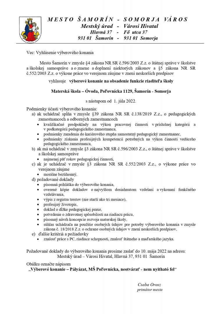 Mesto Šamorín vyhlasuje výberové konanie na obsadenie funkcie riaditeľa školy Materská škola – Poľovnícka, s nástupom od 1. júla 2022. Požadované doklady do výberového konania môžete zaslať do 10. mája 2022.