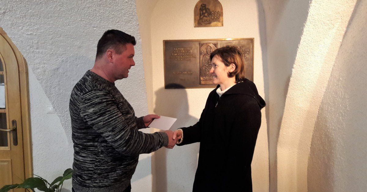 Viceprimátor mesta Csaba Orosz odovzdáva výhru pani Polovkovej.