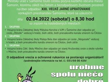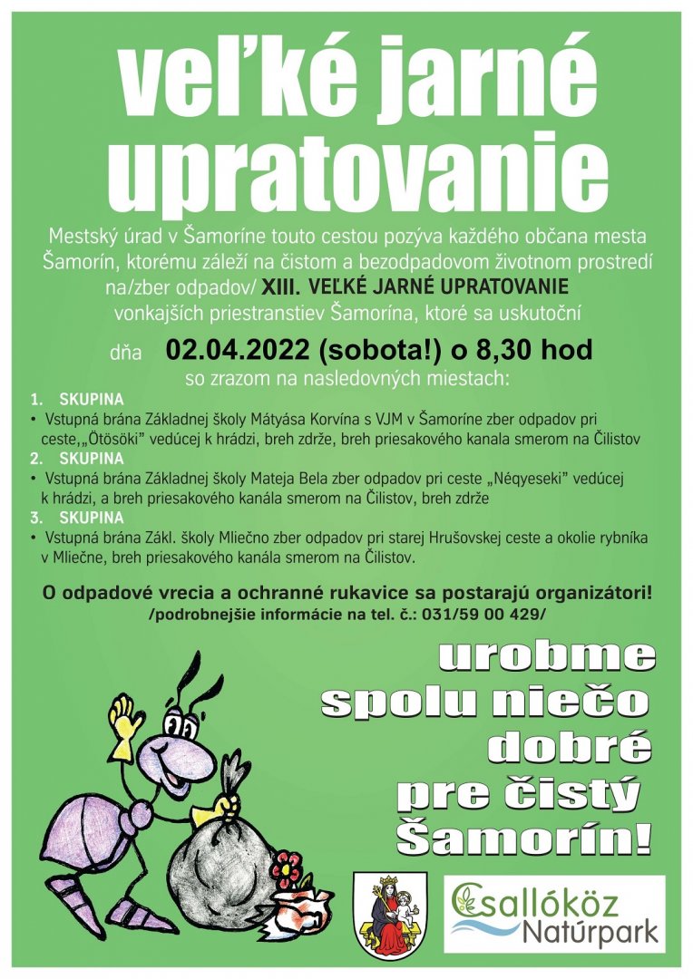 Mesto organizuje veľké jarné upratovanie25.3.2022, 08:41www.samorin.skSamospráva mesta Šamorín organizuje v sobotu, 2. apríla 2022 už XIII. ročník Veľkého jarného upratovania. Podrobný rozpis plánovaných aktivít nájdete na plagáte v prílohe. Zdieľať: