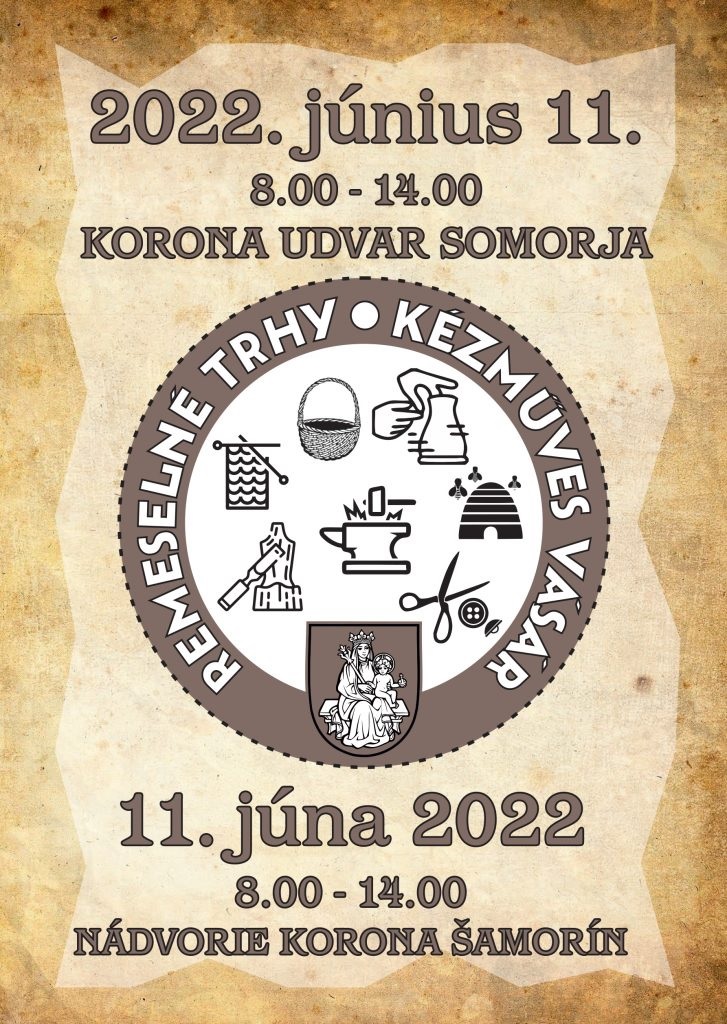 Srdečne pozývame všetkých záujemcov na remeselné trhy v Šamoríne, ktoré sa uskutočnia 11. júna 2022, od 8.00 do 14.00 hod. na nádvorí Korony. Na trhu si môžete zakúpiť rôzne ručne vyrobené predmety z dreva, kovu, prútia, medu, trdelník i slané občerstvenie. Bude možné aj pozrieť sa a vyskúšať si niektoré remeselné zručnosti u remeselníkov.