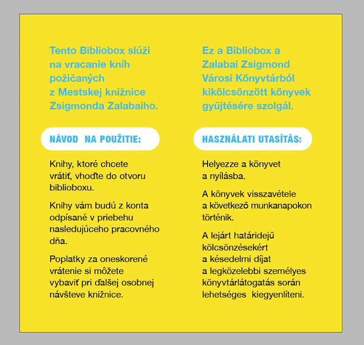 Návod na používanie biblioboxu je nalepený na vrchu zariadenia v slovenskom i maďarskom jazyku.