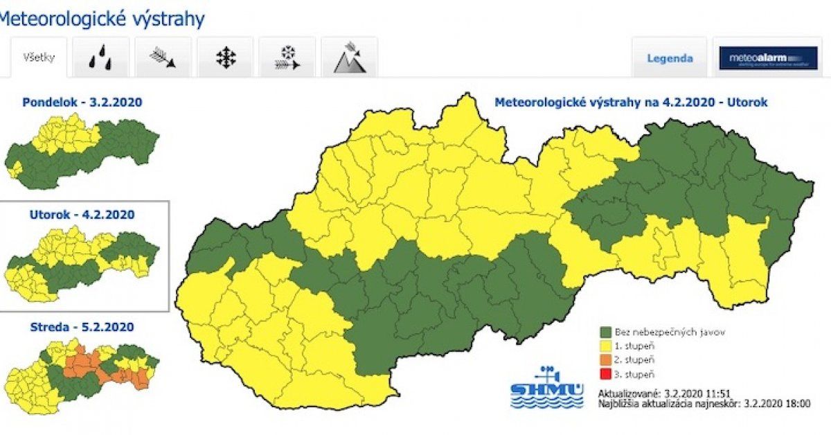 V utorok platí upozornenie od 12. do 18. hodiny, v stredu od polnoci do 18. hodiny. Sila vetra by mala dosahovať okolo okolo 12 m/s (45 km/h) a a krátkodobo (v nárazoch) rýchlosť 18 - 22 m/s (65 - 80 km/h). “Táto rýchlosť predstavuje potenciálne nebezpečenstvo pre ľudské aktivity. Predpokladaná rýchlosť vetra je v danej ročnej dobe a oblasti bežná, ale môže spôsobiť škody menšieho rozsahu,” píše sa na stránke SHMÚ.
