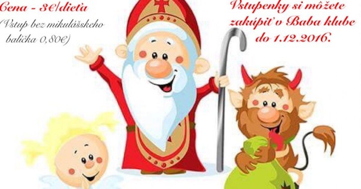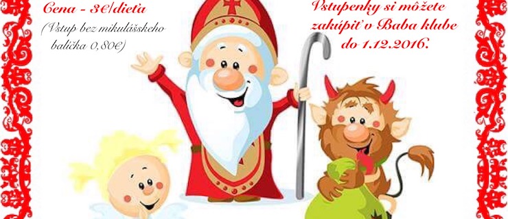 Materské centrum Baba klub vás pozýva na Mikuláša, ktorý príde v piatok, 2. decembra a každému dieťaťu prinesie sladký, ale i zdravý balíček. Za to mu zarecitujeme básničku, ktorú sa počas čakania naučíme.