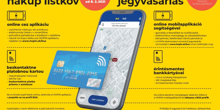 Autobusy na vybranej linke budú vybavené čítačkami platobných kariet a vodiči vyškolení na ich používanie. Nákup elektronického lístku bude možný prostredníctvom aplikácie HOPIN dostupnej v App Store, Google Play alebo Huawei Store. Aplikácia bola rozšírená o profil BUS, ktorý umožní cestujúcim rýchlejšie a pohodlnejšie cestovanie. Návod na jej stiahnutie je dostupný na https://hopintaxi.com/bus.
