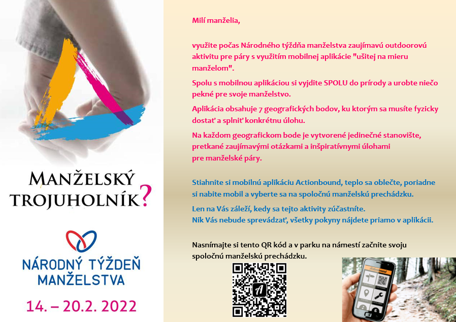 Tento týždeň prebiehajú na Slovensku rôzne aktivity pod hlavičkou Národného týždňa manželstva (NTM). Organizátori NTM pripravili viacero online podujatí pre manželské páry. Okrem online podujatí je tento rok k dispozícii aj aktivita v prírode pre páry s použitím mobilnej aplikácie ušitej na mieru manželom. V Šamoríne sa môžete zúčastniť aj outdoorovej aktivity s využitím mobilnej aplikácie ušitej na mieru manželom.
