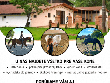 Neváhajte a príďte nás navštíviť. Doprajte si u nás relax, jazdu na koni či individuálny tréning. Radi vám poskytneme aj náš areál na rôzne oslavy či teambuildingy, poprípade aj prenájom haly či koní na rôzne podujatia. Ak hľadáte pre svojho koňa ustajnenie, aj to u nás nájdete. Okrem samotných koní si môžete pozrieť v areáli aj našu Minizoo, kde nájdete kačičky, zajace, sliepky, kozy aj páva.