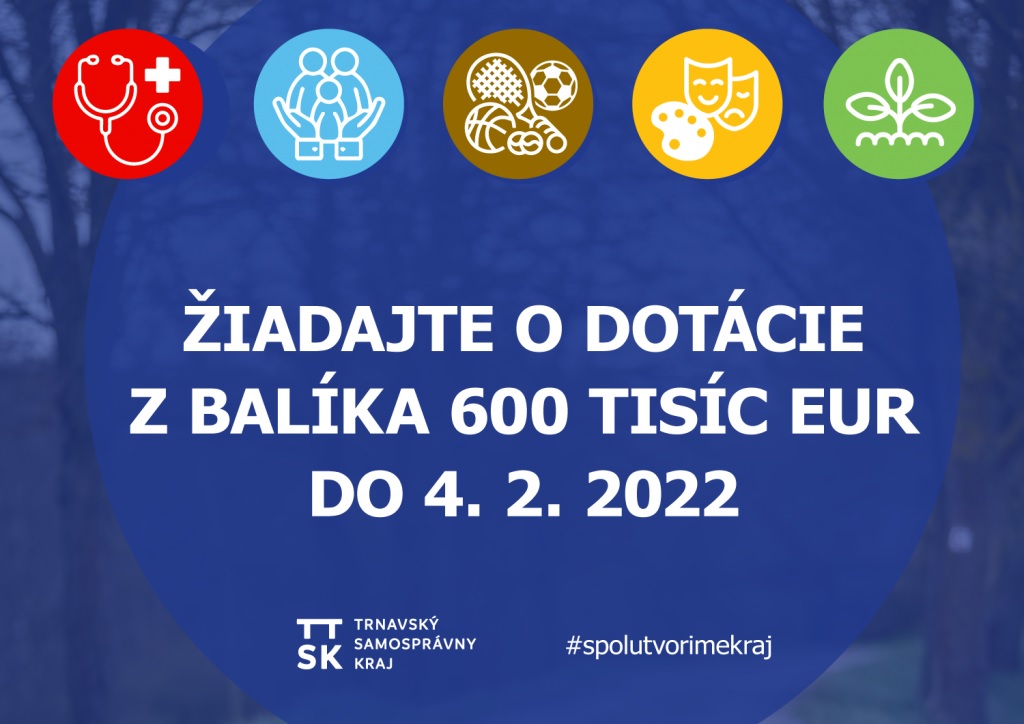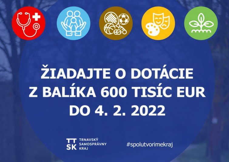 Trnavský samosprávny kraj (TTSK) otvoril dve dotačné výzvy, v rámci ktorých rozdelí spolu 600.000 eur. Obce a organizácie sa môžu uchádzať o podporu aktivít v oblasti kultúry, športu, sociálnej starostlivosti, zdravotníctva a životného prostredia. TASR o tom informoval krajský odbor komunikácie.