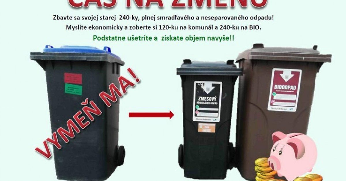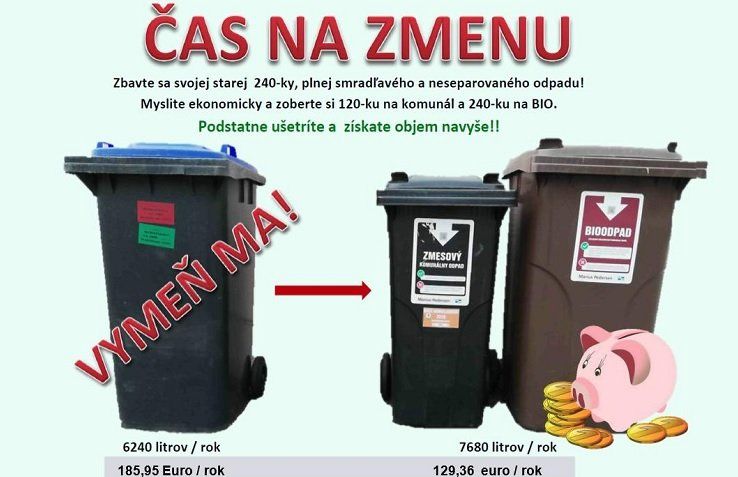 Z tohto dôvodu si Vás dovoľujeme požiadať O ZVÁŽENIE VÝMENY 240-litrovej zbernej nádoby na ZKO za 120-litrovú zbernú nádobu na ZKO + 240-litrovú nádobu na bioodpad.