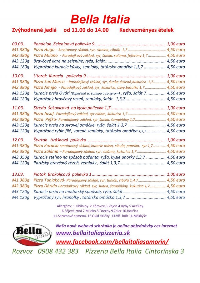 Projekt EVSObedové menu reštaurácie Bella Italia: 9. až 13. marec9.3.2020, 06:10OznamŠamorínčan a reštaurácia Pizzeria Bella Italia Vám prinášajú obedové menu na aktuálny týždeň.Zdieľať:Podobné články Prieskum podnikateľského prostredia v Šamoríne - inovácie, spokojnosť v regióne a ťažkosti s podnikaním21.12.2020, 11:00 Prieskum podnikateľského prostredia v Šamoríne - základné informácie a zručnosti a kvalifikácia12.12.2020, 13:11 Nechajte si svoj obed doviezť domov, alebo do práce19.10.2020, 09:58 Obedové menu reštaurácie Market Bistro & Cafe 19. október až 23. október19.10.2020, 09:55 Obedové menu reštaurácie Market Bistro & Cafe 5. október až 10. október5.10.2020, 08:15 Nechajte si svoj obed doviezť domov, alebo do práce5.10.2020, 08:13