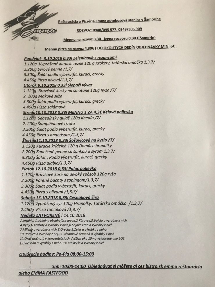 Šamorínčan a reštaurácia a pizzéria Emma(budova autobusovej stanice) Vám prináša obedové menu na aktuálny týždeň. Pozor! V reštaurácií sa dá platiť aj stravnými lístkami pre dôchodcov!
