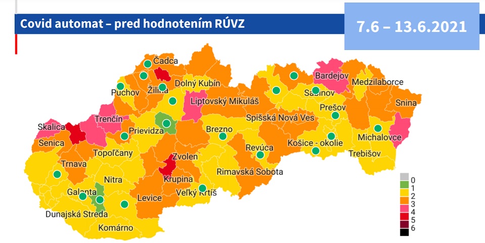 Epidemická situácia na Slovensku sa naďalej zlepšuje. Okres Dunajská Streda zostáva v žltej farbe. Od pondelka 7. júna budú na Slovensku ešte stále tri červené okresy podľa farebnej škály Covid automatu, prvýkrát však pribudnú aj zelené okresy s najlepšou epidemickou situáciou a najmäkšími obmedzeniami.