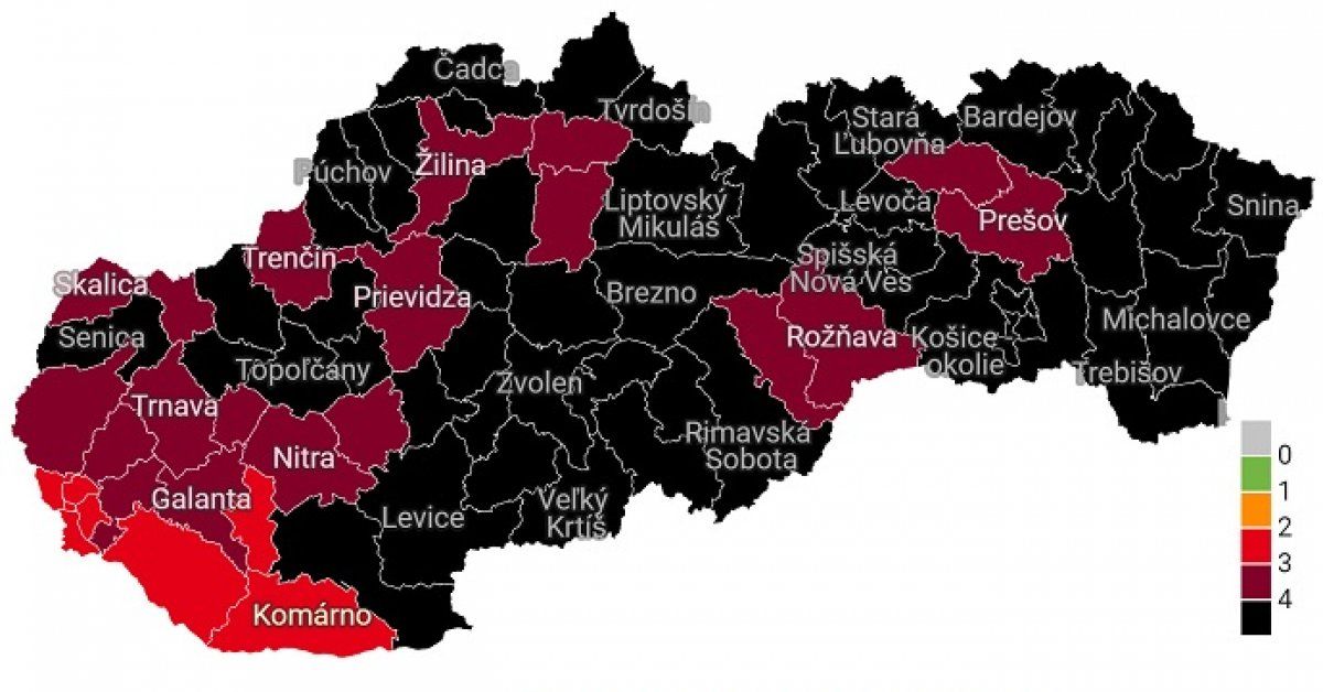 Oranžové okresy už od budúceho týždňa nebudú, tento týždeň boli posledné dva. V červenej farbe, ktorá je treťou najprísnejšou po čierne a bordovej, zostane už len Bratislava, Dunajská Streda, Komárno a Šaľa. Naopak, Košice budú od pondelka v čiernej.