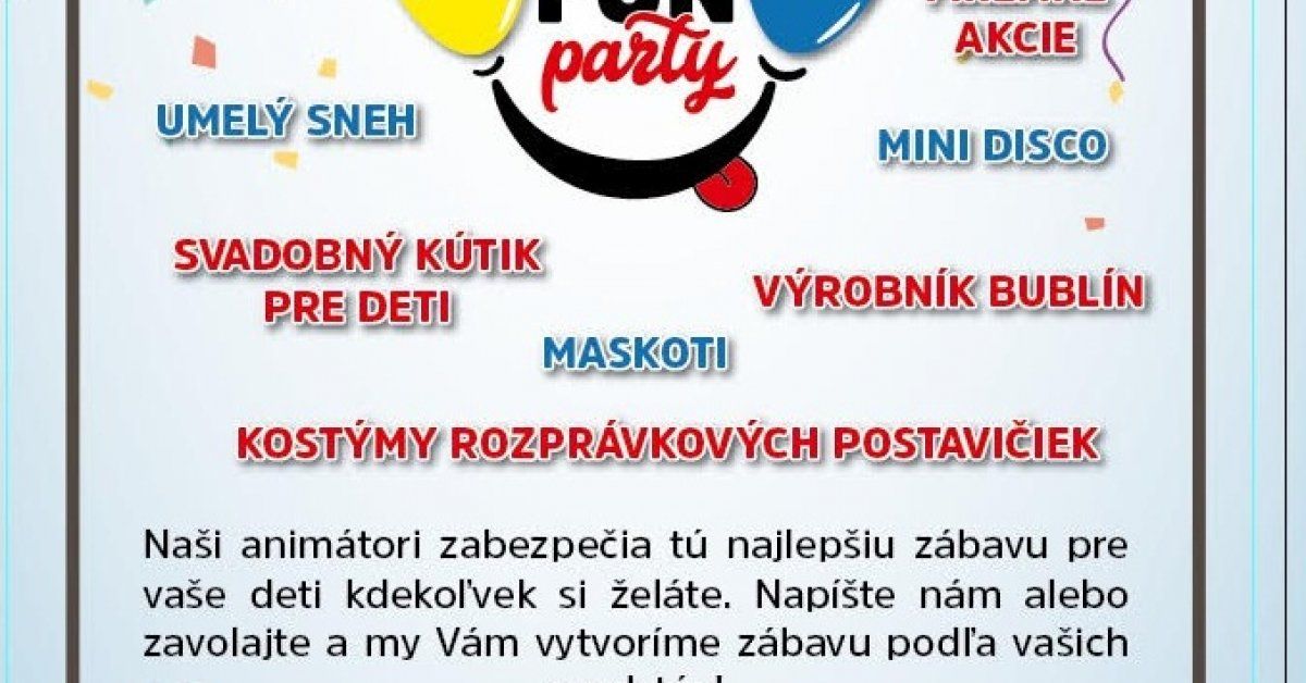 Zárukou, že zábava sa naozaj podarí, sú napríklad aj maskoti, hry, súťaže, glitrové tetovanie, maľovanie na tvár, minidisco, či umelý sneh, alebo aj bublinkovy stroj. To všetko ponúka spoločnosť Fun party, ktorá už vyčarila úsmevy na tvárach mnohých detí.