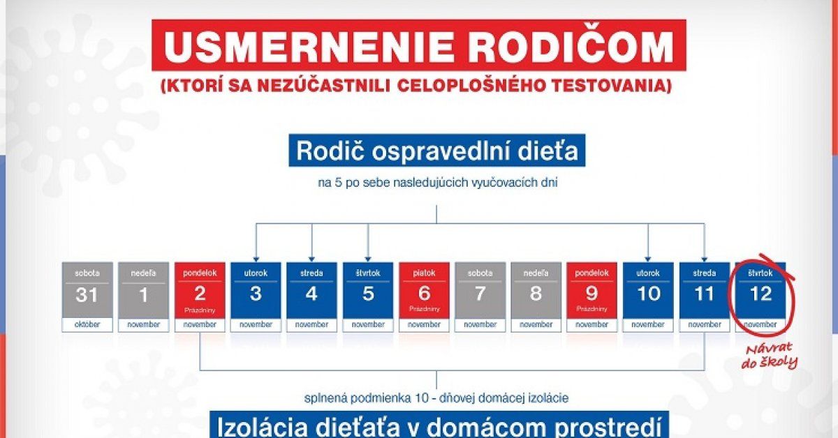 Ak ste neboli na testovaní, poslať dieťa do školy rezort školstva v usmernení explicitne nezakazuje. Ministerstvo školstva však odporúča, aby rodič bez testu na najbližších desať dní nedával svoje dieťa do školy. Podľa rezortu môže rodič dieťa ospravedlniť na 5 dní – a to na 3., 4., 5. november a 10., 11. november 2020.