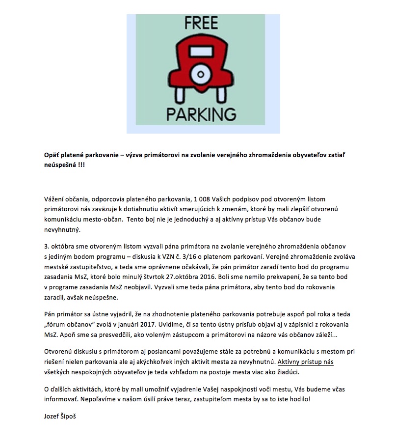 Podľa p. primátora Gabriela Bárdosa odklad verejného zhromaždenia súvisí s tým, že koncom roka uplynie polročná doba fungovania plateného parkovania a bude tak možné jeho komplexné zhodnotenie.