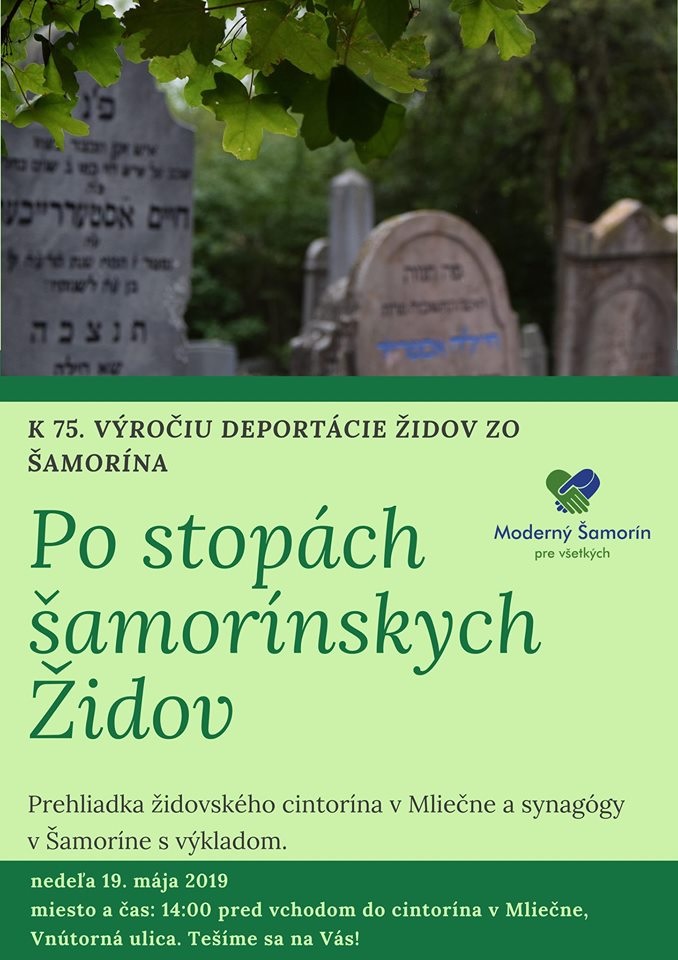 Vlastivedná prehliadka k 75. výročiu deportácie šamorínskych Židov s názvom "Po stopách šamorínskych Židov" začína v nedeľu 19. mája 2019 o 14:00 na židovskom cintoríne v Mliečne a bude pokračovať návštevou šamorínskej synagógy.