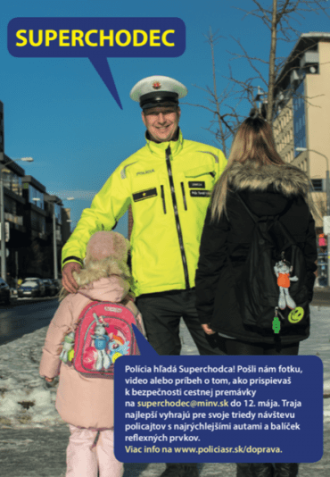 Prvý preventívny projekt SUPERCHODEC je určený pre základné školy. Zapojiť sa doň môžu jednotlivci, ale aj kolektívy. Ich jedinou úlohou je poslať do 12. mája na e-mailovú adresu superchodec [at] minv.sk fotografie, videá alebo skutočné príbehy o tom, ako zo svojho pohľadu chodcov prispievajú k bezpečnosti premávky. Je len na žiakoch, či pošlú napríklad svoje fotografie s reflexnými prvkami, videá správneho prechádzania cez cestu, alebo svoj deň ako chodca opíšu vo forme príbehu. Po uzávierke súťaže polícia vyberie troch výhercov, ktorí pre svoju triedu vyhrajú návštevu policajtov s najrýchlejšími autami a balíčky reflexných prvkov. Trieda SUPERCHODCA alebo SUPERCHODCOV bude aj prezentovaná na oficiálnom policajnom Facebooku.