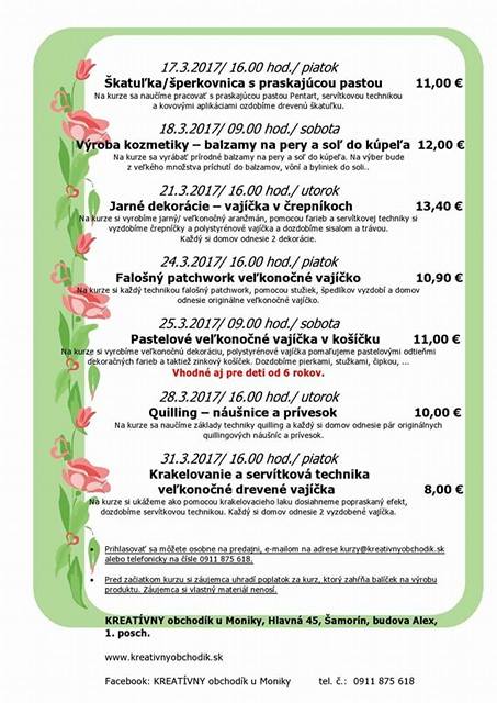 Prihlásiť sa môžete priamo v predajni, telefonicky na čísle 0911 875 618 alebo mailom na kurzy [at] kreativnyobchodik.sk