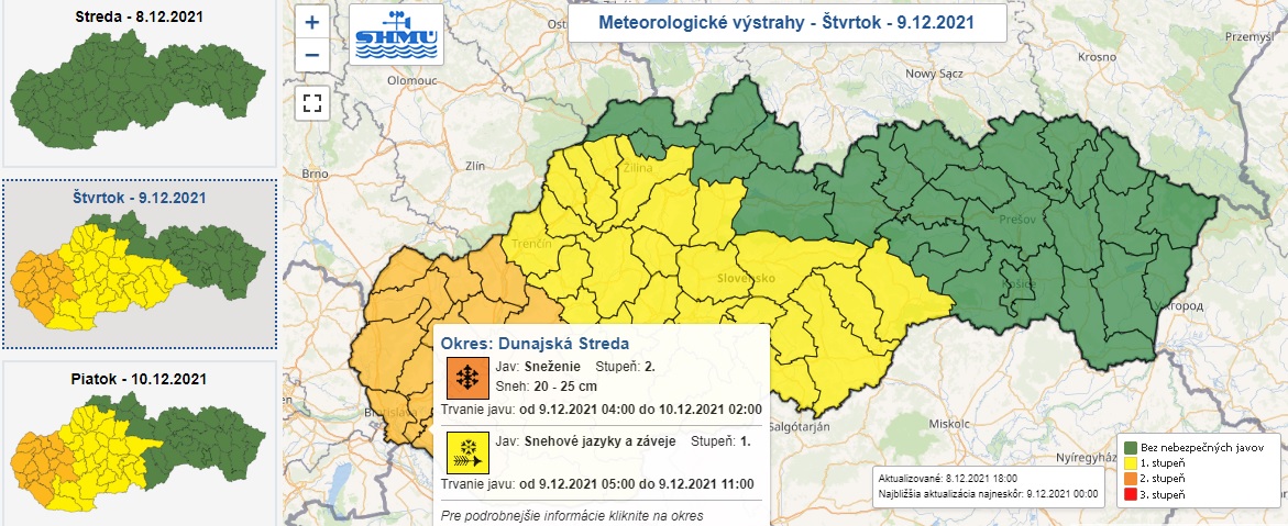 V okrese Dunajská Streda sa očakáva výskyt silného sneženia, pri ktorom spadne väčšinou 10 až 20, ojedinele 20 - 25 cm nového snehu.