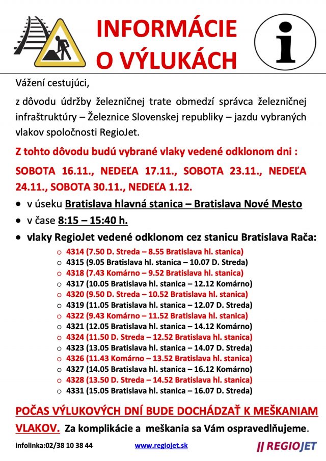 Pozor na víkendové výluky na trati Bratislava - Komárno