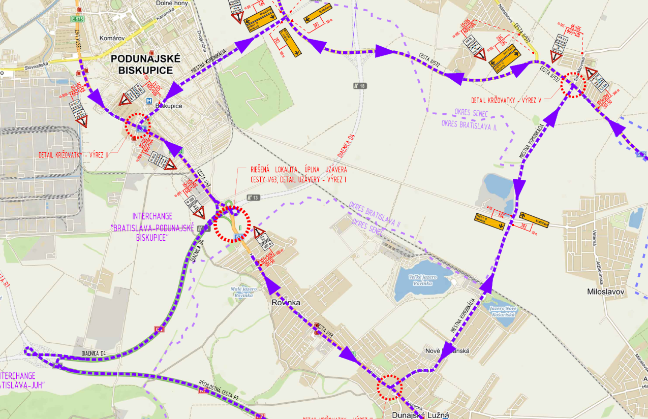 Uzávierka cesty I/63 v mieste križovatky Rovinka je plánovaná od 11. 09. 2020 22.00 h do 16. 09. 2020 04.00 h. Nákladná doprava a vozidlá s platnou diaľničnou známkou budú využívať rýchlostnú cestu R7 a diaľnicu D4. Osobné vozidlá bez diaľničnej známky a autobusy budú vedené po novej ceste II/572 – obchvat Mostu pri Bratislave. Autobusová doprava bude stále obsluhovať Rovinku s tým, že sa v mieste čerpacej stanice Batax otočí a bude pokračovať na uvedenú obchádzkovú trasu.