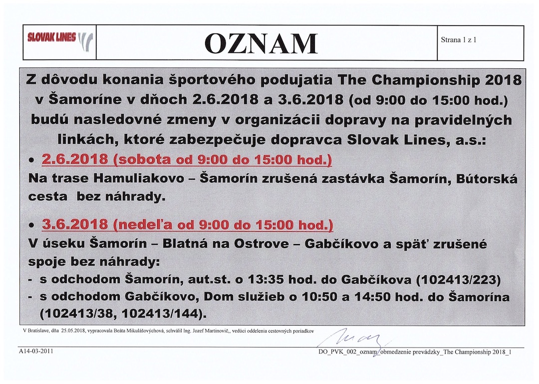 Počas nasledujúceho víkendu sa v Šamoríne uskutoční svetový šampionát The Championship 2018. Toto prestížne podujatie si však vyžiada v sobotu 2. júna a nedeľu 3. júna niekoľko dopravných obmedzení.