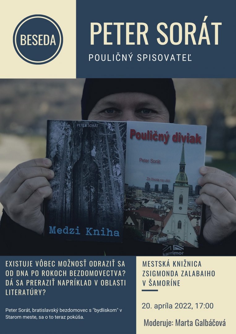 Srdečne vás pozývame na literárnu besedu s Petrom Sorátom,autorom knihy „Pouličný diviak“ a "Medzi Kniha" dňa 20. apríla 2022 o 17:00 hod.