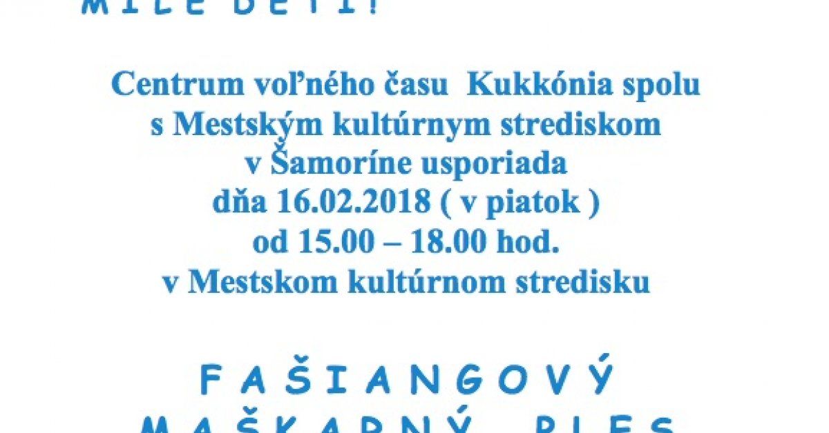 Pozvánka na detský maškarný ples26.1.2018, 09:26OznamCentrum voľného času Kukkónia spolu s Mestským kultúrnym strediskom v Šamoríne usporiada Fašiangový maškarný ples.Zdieľať: