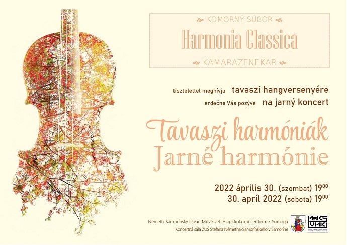 Komorný orchester Harmonia Classica sa po dvoch rokoch vracia so samostatným večerom. Koncert s názvom Jarné harmónie sa uskutoční v sobotu 30. apríla 2022 od 19.00 hod. v koncertnej sále Základnej umeleckej školy Štefana Németha-Šamorínskeho. Na koncerte zaznejú diela Dvořáka, Bizeta, Brahmsa, Šostakoviča, Gardela a ďalších skladateľov.