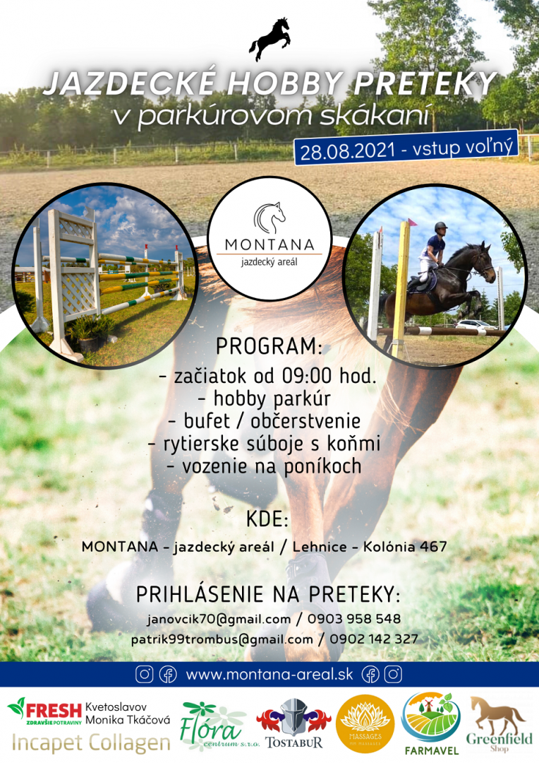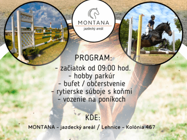 Milí jazdci, deti a dospelý v mesiaci August vás srdečne pozývame na JAZDECKÉ HOBBY PRETEKY v parkúrovom skákaní. Využite príležitosť pokochať sa pohľadom na krásne kone a jazdcov. Je len málo miest, z ktorých cítiť skutočnú lásku ku koňom, no jazdecký areál MONTANA v Lehniciach je rozhodne jedným z nich, preto neváhajte a príďte si užiť skvelý deň s koňmi!