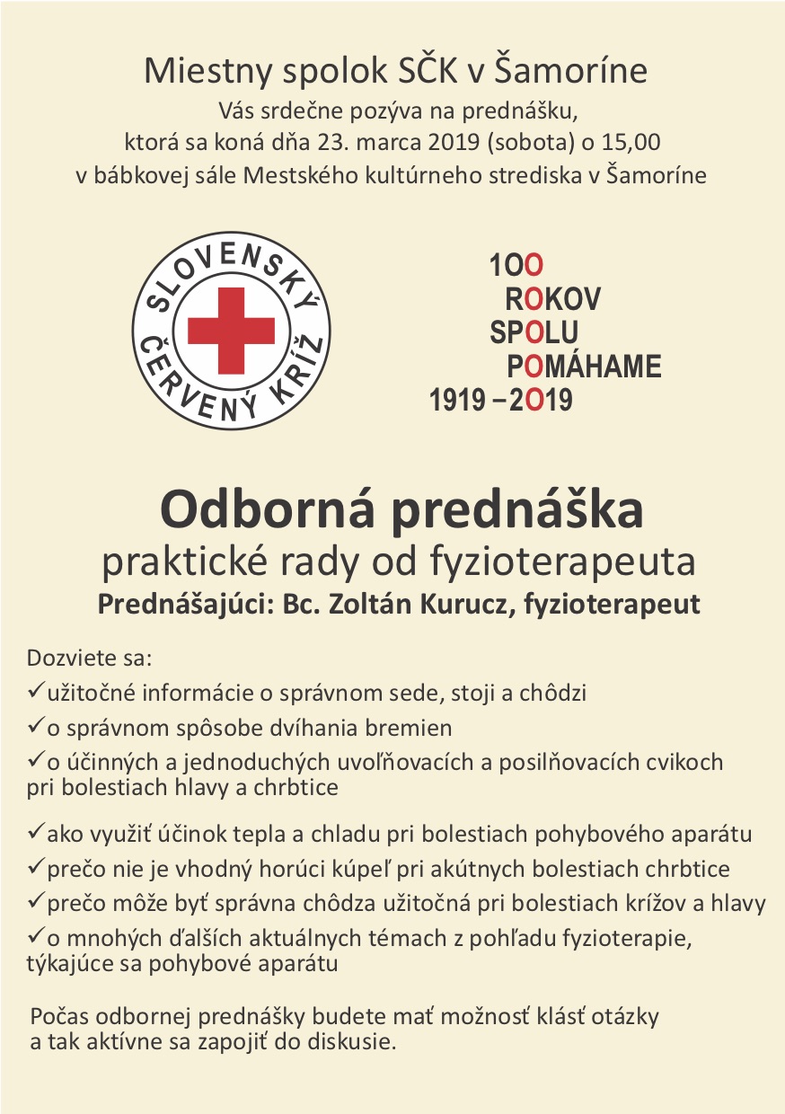 Miestny spolok SČK v Šamoríne Vás srdečne pozýva na prednášku, ktorá sa koná dňa 23. marca 2019 (sobota) o 15.00 hod. v bábkovej sále Mestského kultúrneho strediska v Šamoríne.