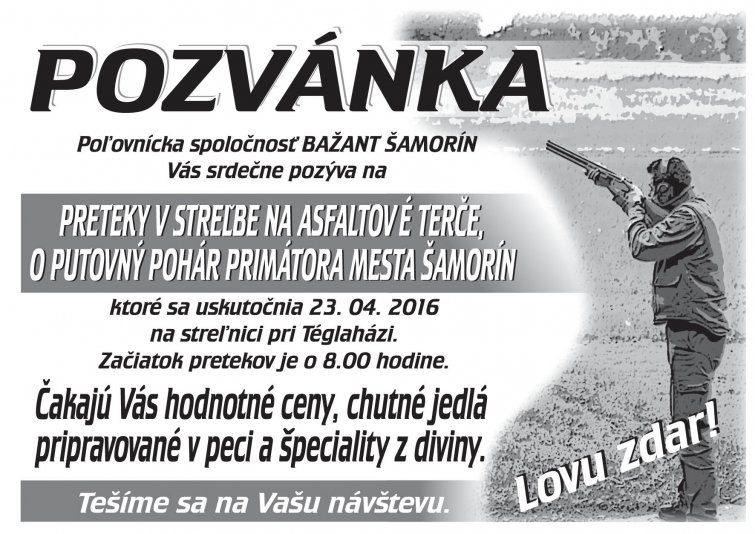 Organizátorom súťaže je poľovnícka spoločnosť Bažant Šamorín.