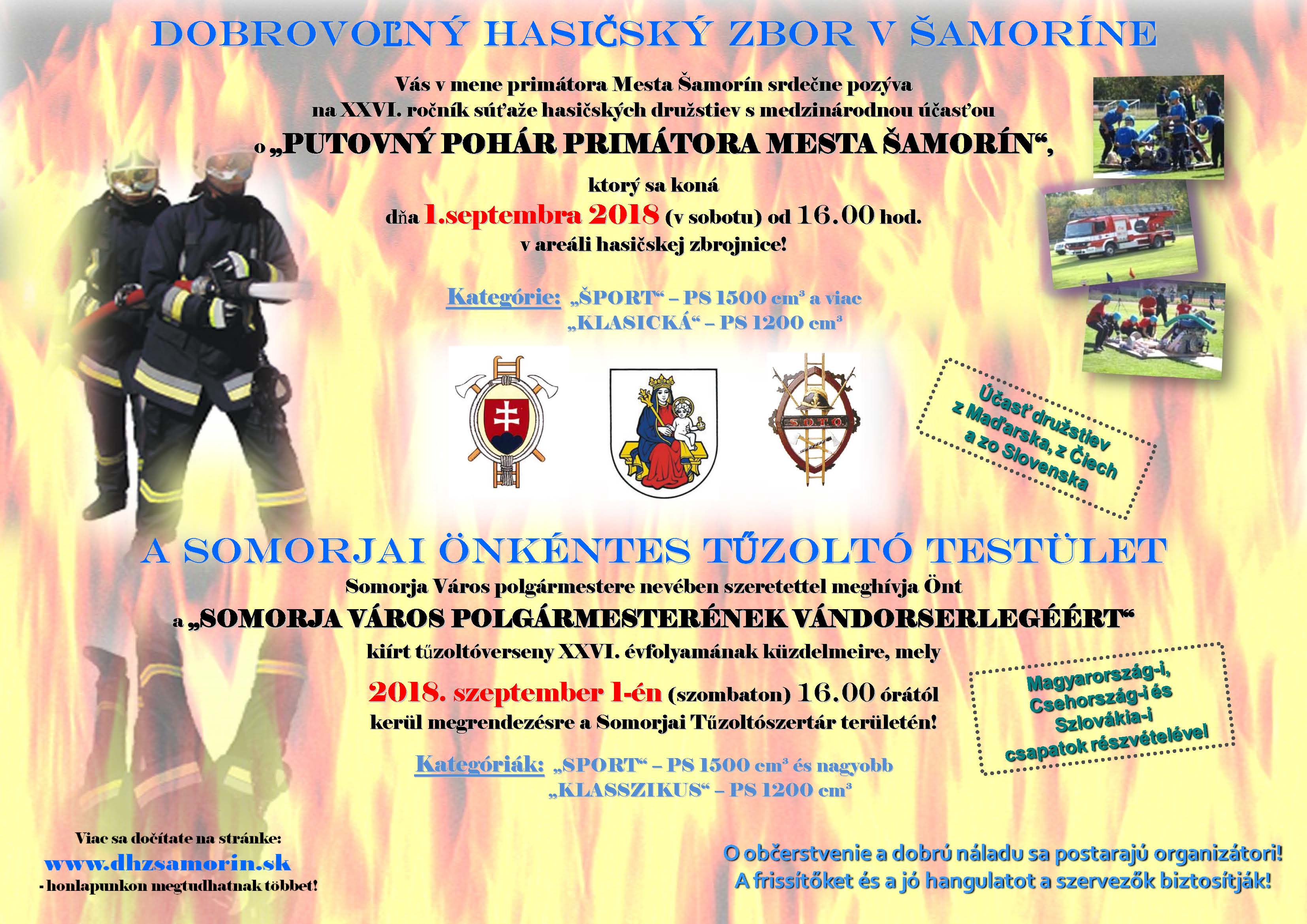 Dobrovoľný hasičský zbor v Šamoríne Vás srdečne pozýva na XXVI. ročník súťaže hasičských družstiev s medzinárodnou účasťou o „Putovný pohár primátora mesta Šamorín“.