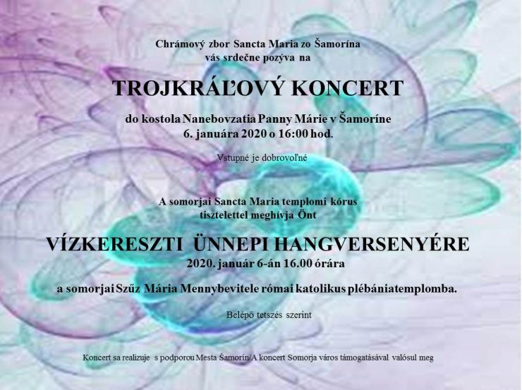 Pozvánka na Trojkráľový koncert3.1.2020, 09:28OznamChrámový zbor Sancta Maria vás srdečne pozýva na Trojkráľový koncert.Podujatiesa tradične uskutoční 6. januára. Vstupné je dobrovoľné.Zdieľať:
