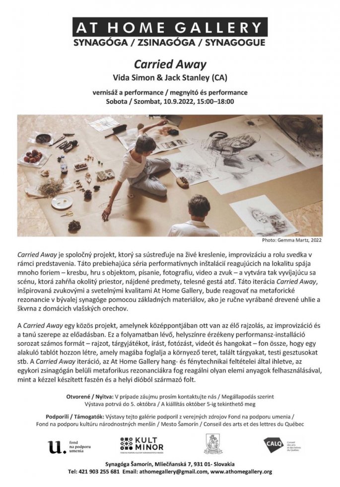 Pozvánka na vernisáž výstavy „Carried Away“ 6.9.2022, 16:23At Home GalleryZnáma šamorínska galéria At Home Gallery vás pozýva na novú pripravovanú výstavu spoločného projektu Simona Vidu a Jacka Stanleyho. Vernisáž výstavy sa uskutoční už túto sobotu 10.9. 2022, 15:00-18:00.Zdieľať: