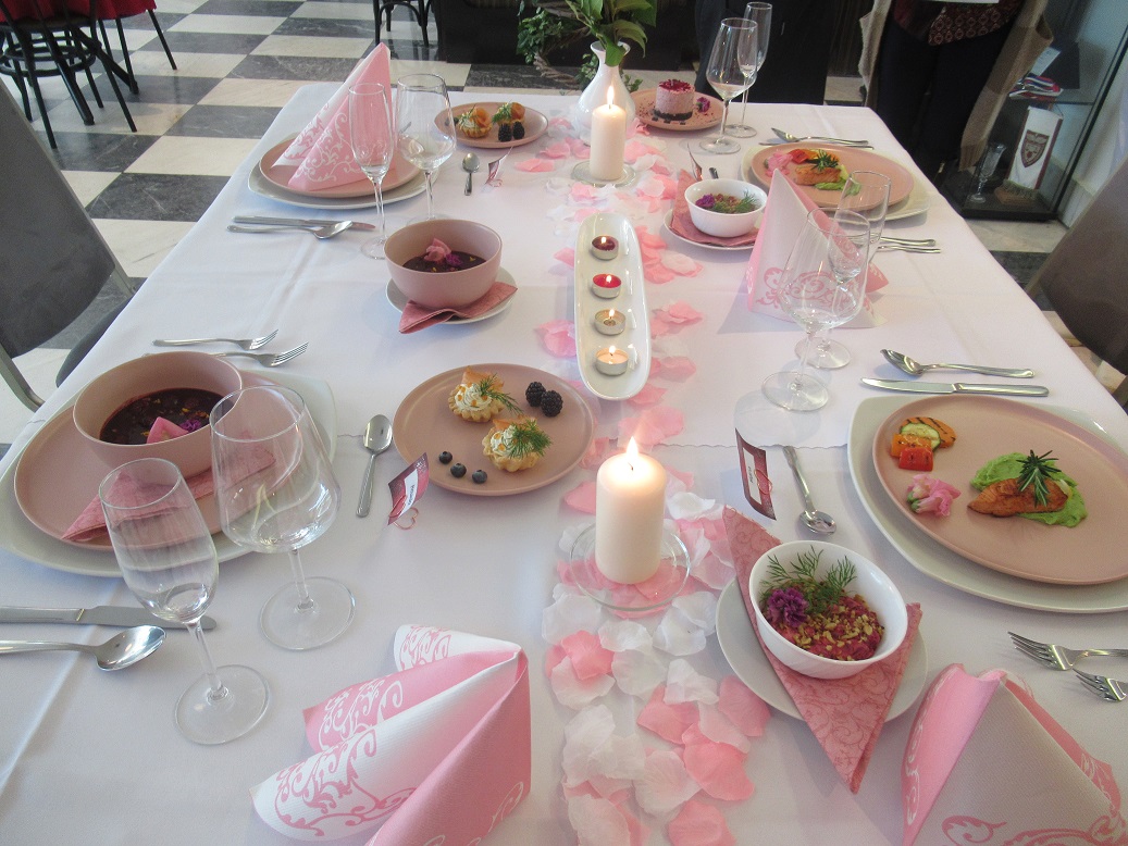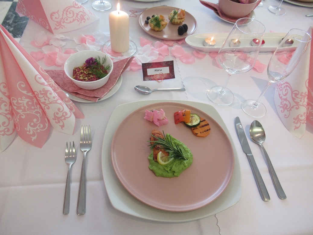 Napriek všetkým obmedzeniam pripravili budúci maturanti rôzne variácie valentínskeho posedenia, ktoré sa nieslo v tónoch zlato-bielej, bielo-ružovej, až po bielo-červené slávnostné prestieranie. Pri jednom stole nás zaujali originálne vlastnoručne vyrobené menovky v srdiečkovom stojane posypané trblietkami. Ďalší stôl pútal našu pozornosť brúsenými dekoračnými kamienkami vynímajúcimi sa na zlatej štóle a umocňujúce jedinečnosť chvíle.