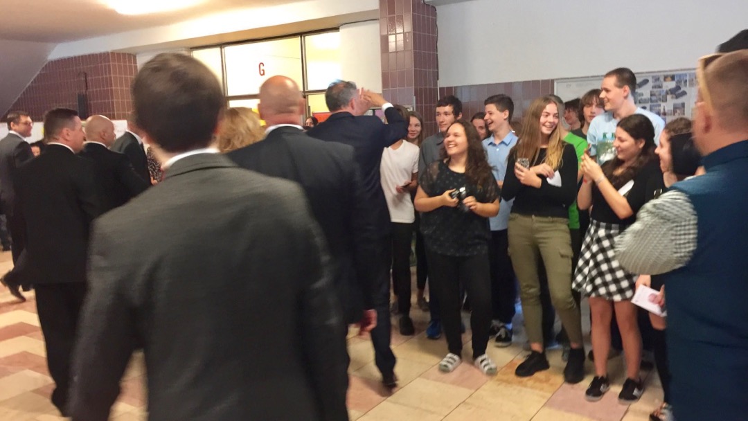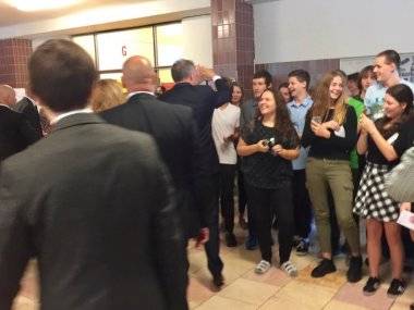 Keď vošiel do budovy, spontánne mu zatlieskali desiatky študentov. Najskôr sa prezident stretol na krátkej diskusii s predstaviteľmi oboch škôl. Rozhovoru sa zúčastnili aj zástupcovia študentov ako aj rodičov.